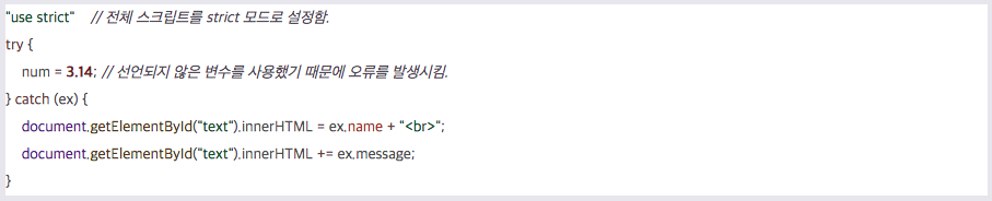 - ECMAScript 5에서 처음으로 소개된 strict 모드는 자바스크립트 코드에 더욱 엄격한 오류 검사를 적용해 줍니다.