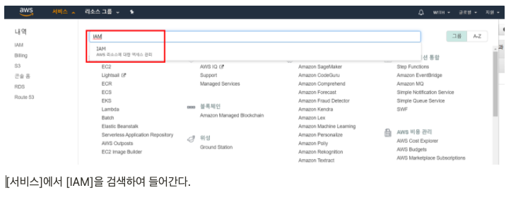 - AWS 계정 생성 후 로그인을 하고 IAM 설정을 위해 서비스 카테고리에서 IAM 을 검색한 후 IAM 으로 이동한다