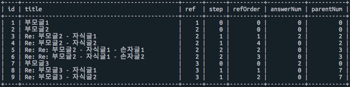 위와같은 구조의 테이블이 있을 때, 계층형으로 정렬하기 위한 쿼리는 아래와 같다